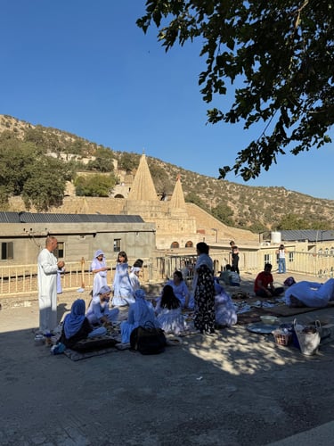 Walk through Lalish temple, the most sacred site to the believers in Yazidism. Situated in a valley where the founder of the faith is buried.